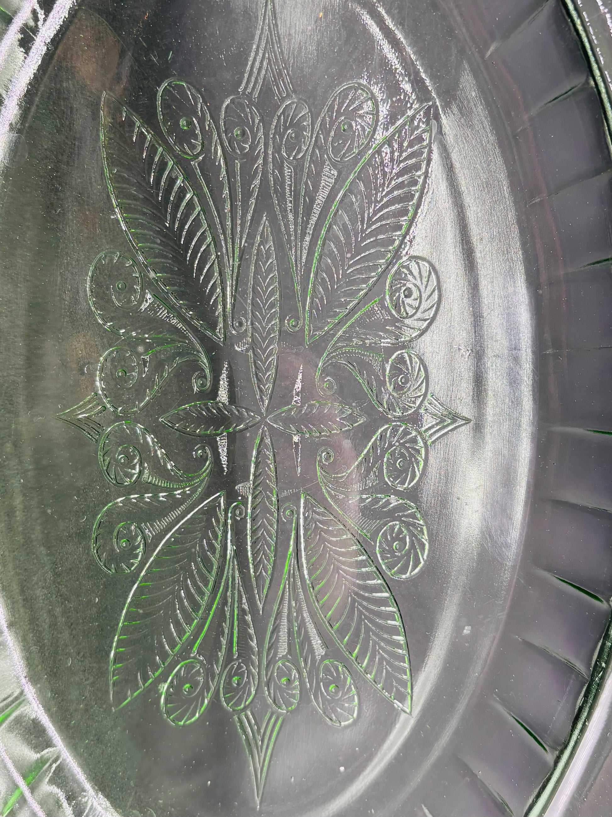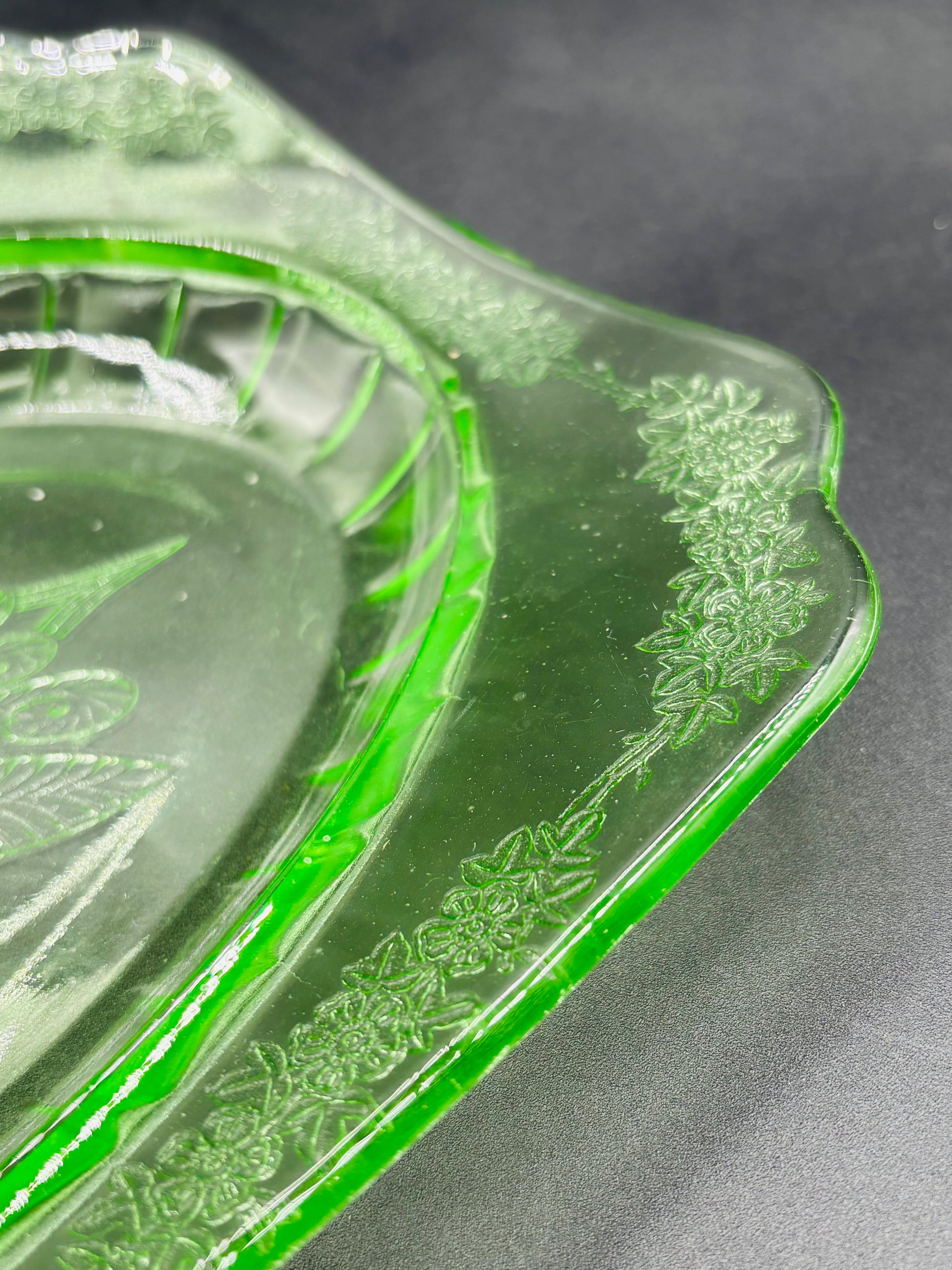 Features: Maker: Jeannette Glass Company (USA) Pattern: Adam — elegant floral & Art Deco design Material: Depression-era pressed glass Shape: Rectangular with an inset oval or floral-etched center Color: green